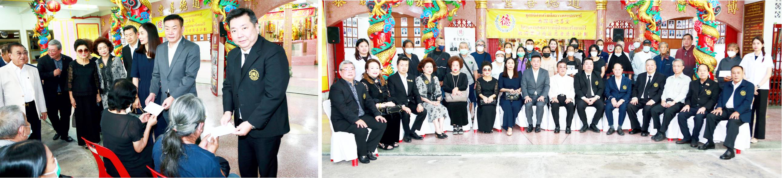 图左:张少雄伉俪、陈文强董事长向贫困患者分发救济金。图右:道德善堂首长与获济助的贫困癌症患者合影。