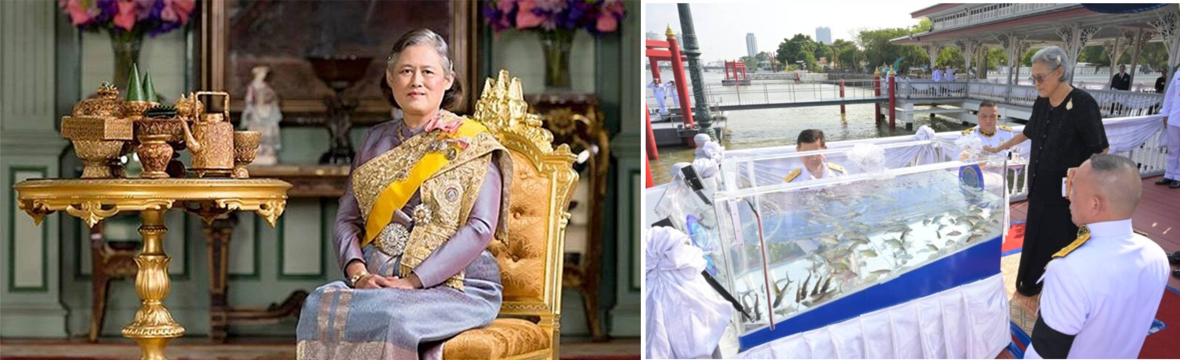 仪式现场,殿下亲自主持各项环节,先向待放生的牛群洒下圣水,寄托美好祈愿,随后将两头牛放生,并将其恩赐给黎逸府孟双县农普镇的一户村民,传递皇室对民众的关怀。在水生动物放生环节,殿下同样向鱼缸洒上圣水,剪开缸上丝带,亲手将59万尾淡水鱼放流至湄南河,以践行慈悲向善的传统,祈愿国泰民安、生灵安康。