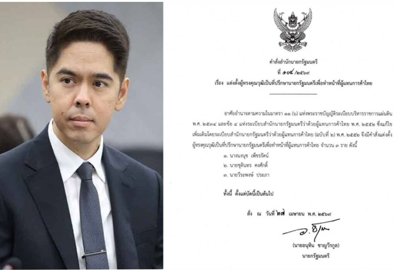 4月27日,阿努廷签署《总理府第 2026/104 号政令》,依据相关任职资质要求,正式委任侬努・佩查拉、楚町通・孔萨、维拉蓬・巴帕三人出任总理顾问,并承担泰国贸易代表相关工作职责。