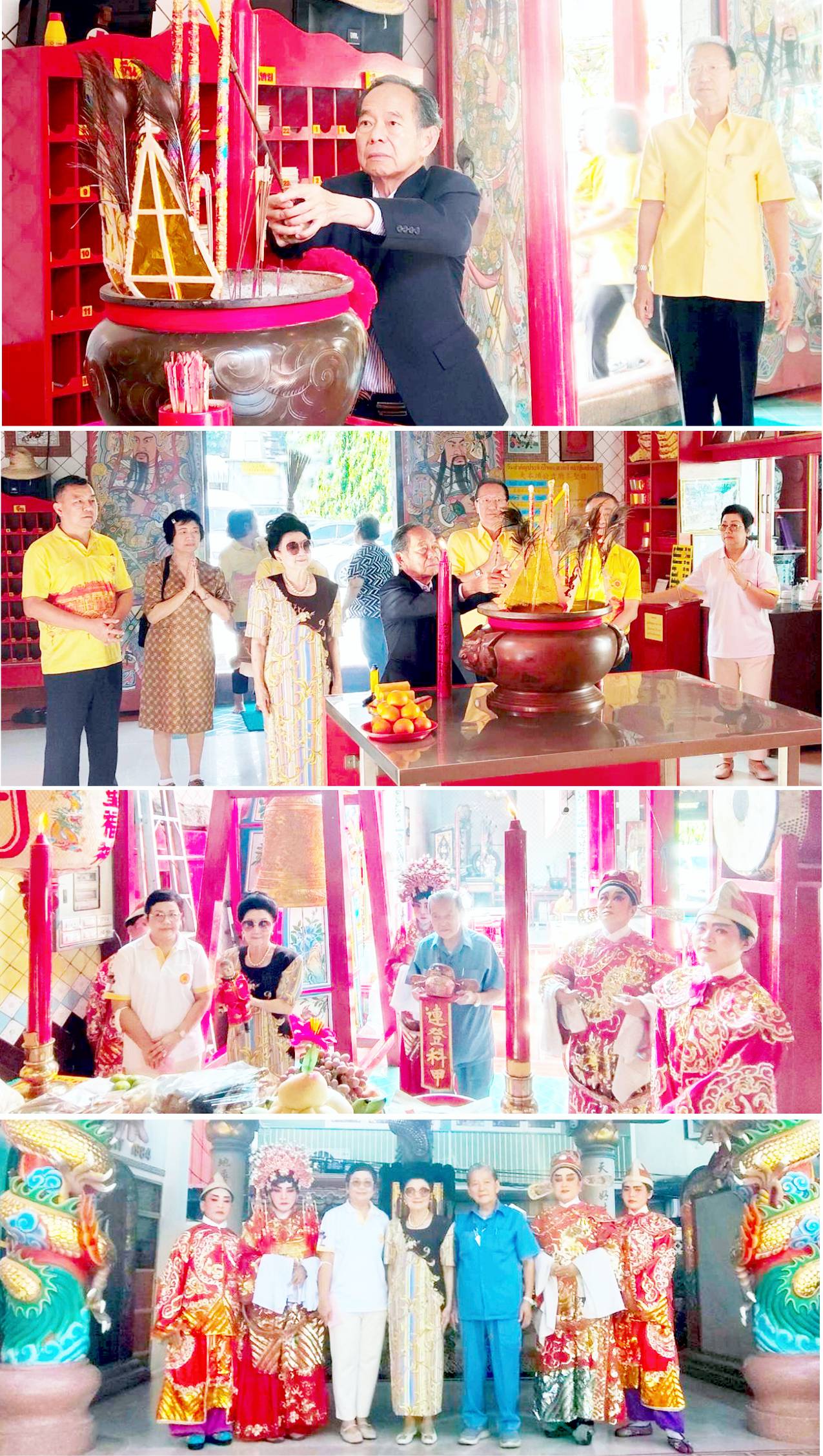 图1:泰国潮州会馆主席徐惠深向大本头公香案明烛上香虔诚膜拜。图2:徐惠深与邱燕桂、钟木强、蔡蔚生等合拜诸福神,香烟缭绕圣光。图3:徐惠深主席、邱燕桂、钟木强、蔡蔚生、吴学聪、张雪云、陈梓等上香膜拜大老爷。图4:邱燕桂、郑永国、张雪云与潮剧演员合影,双节喜气融融。