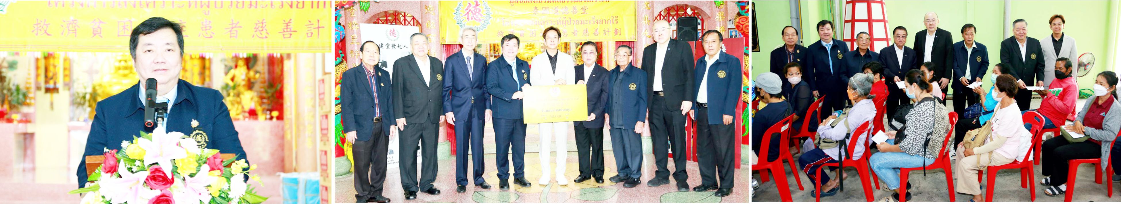 图左:陈文强董事长主持仪式时致词。图中:周少彬名誉顾问赞助经费五万铢及盂兰胜会善款一万铢,由陈文强董事长接领,与黄迨光博士、吴长发、郑岳龙、许景杓、陈世岳、吴金城、张让源、蔡锦洲、张永南合影。图右:陈文强、黄迨光、吴长发、郑岳龙、许景杓、陈世岳、周少彬、吴金城向癌症患者颁发救济金。