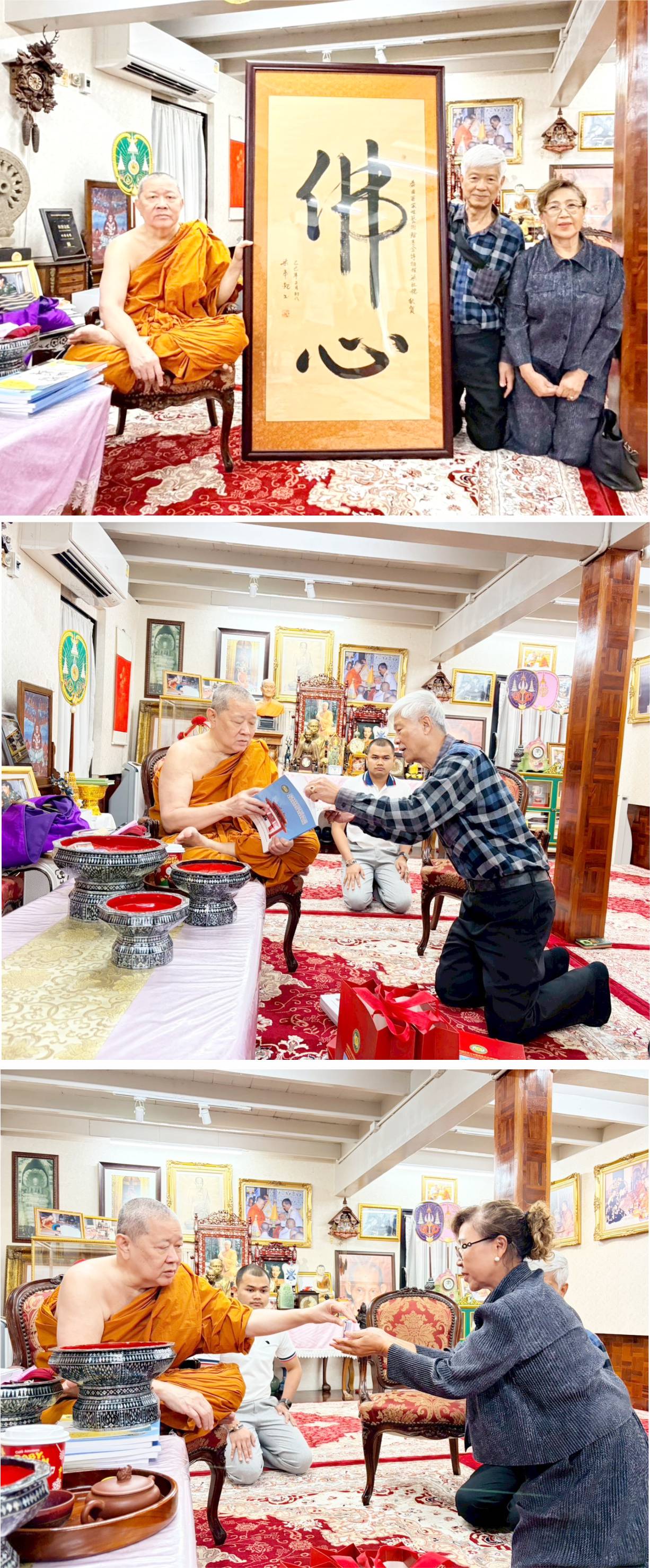 并赠送岱密中学孔子课堂六本国语和方言教材图上:梁柱稳主席向颂德通猜副僧王赠送中国方言教材以及中国书法作品《佛心》表示感谢。图中:梁柱稳主席向颂德通猜副僧王赠书。图下:颂德通猜副僧王向梁关雪芬赠送佛像。202...