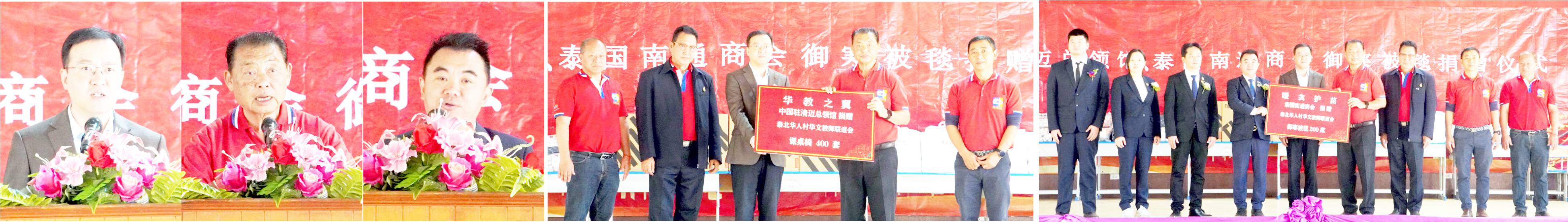 被泽侨乡.暖衾护苗赠送冬被活动图1:(左起)中国驻清迈总领事陈海平致辞,泰北华人村华文教师联谊会王相贤会长致辞,泰国南通商会会长徐晓春致辞。图2:中国驻清迈总领事陈海平捐赠课桌椅四百套,由王相贤会长接领。图...