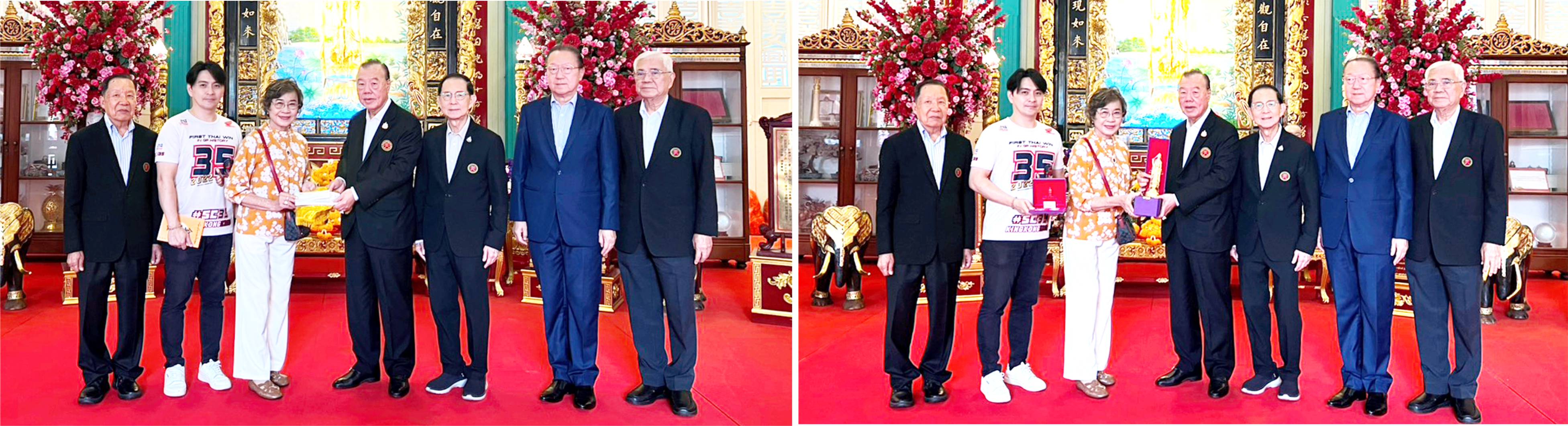 以报答双亲恩德 郭光国董事长暨陈伟能、钟木强、郑定沛、林盛等接领善款致谢图左:连素干耶女士暨孙辈捐赠一百万铢善款,郭光国董事长接领,与副董事长陈伟能、钟木强、郑定沛、林盛合影。图右:郭光国董事长敬赠观世...
