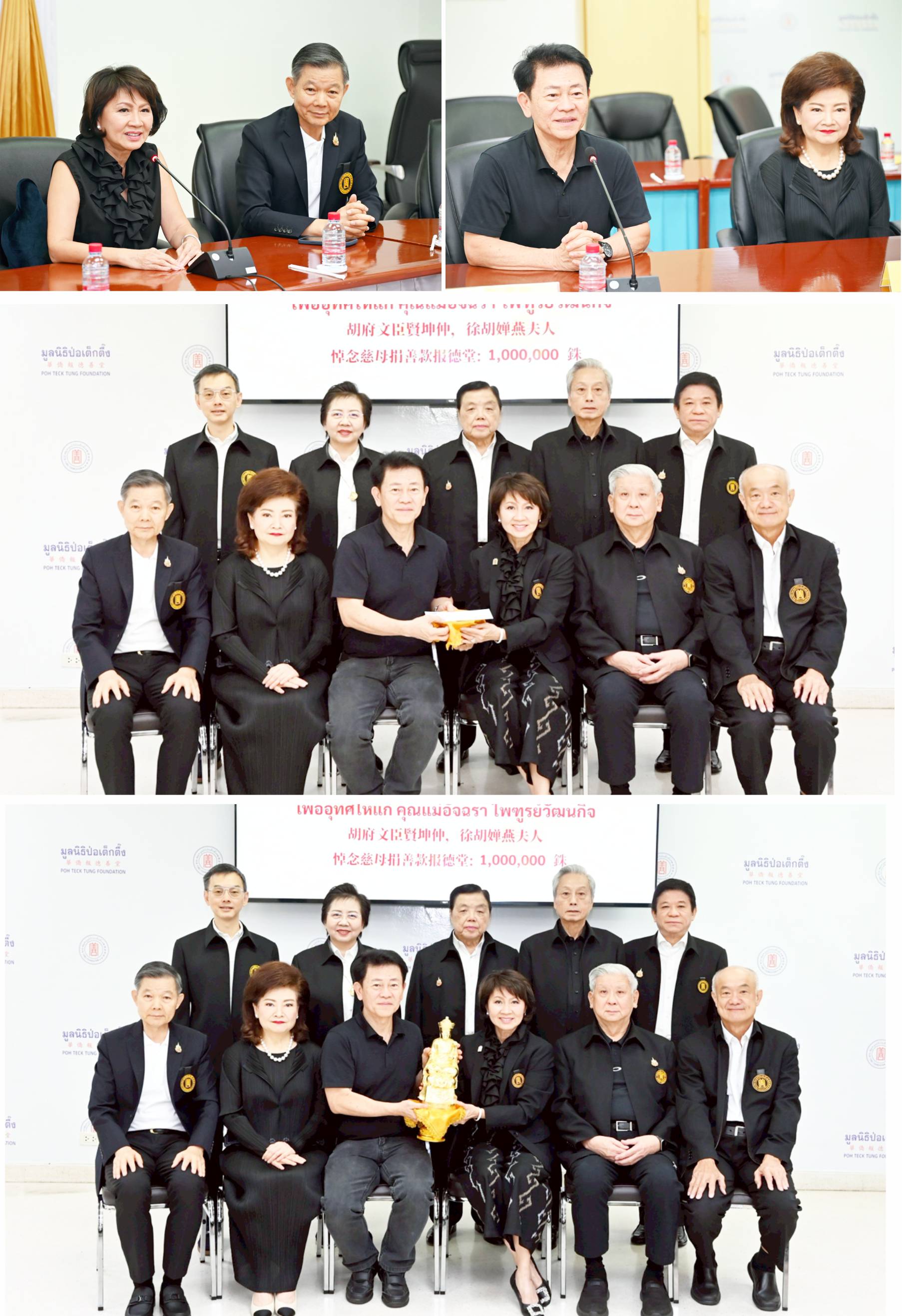 图上:(左至右)报德善堂副董事长徐光辉出席座谈,董事秘书长胡宝媛致谢词。胡文臣、胡婵燕贤昆玉在座谈时发言。图中:胡文臣、徐光辉胡婵燕伉俪代表合家捐赠一百万铢,由胡宝媛女士接领,与吕烈鑫、黄维庆、侯映辉、...