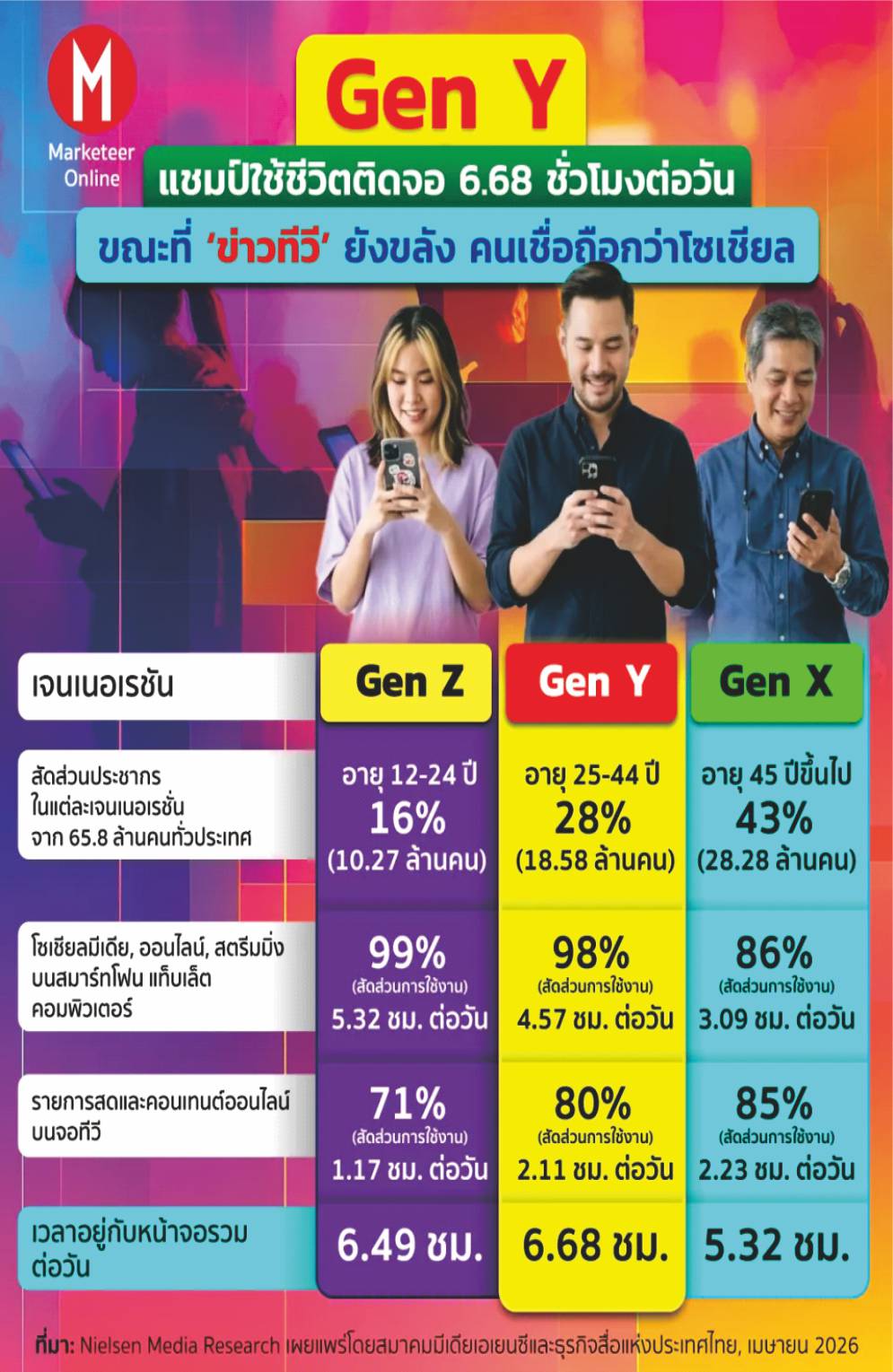 与此同时,Y世代观看电视直播节目和网络内容的时长高于Z世代,日均达2.11小时。而占泰国人口近一半的X世代,尽管总屏幕使用时间少于其他群体,却是电视直播节目和网络内容的主要消费群体,日均使用时长最长。